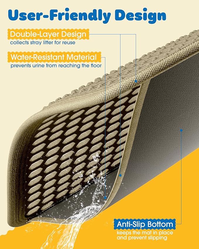 - WATERPROOF LITTER MAT: Powools litter mat for litter box features a waterproof bottom layer, preventing urine and other liquids from seeping down to the floor. It helps protect the hardwood floor and carpets from damage and stubborn stains. The anti-slip backing keeps the mat in place without moving while in use.