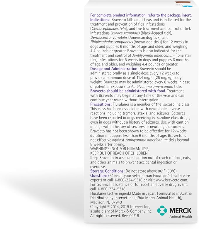 BRAVECTO Chew for Dogs, Flea & Tick, 1 Chew, 12 Week Supply, >44-88 lbs., Blue Box