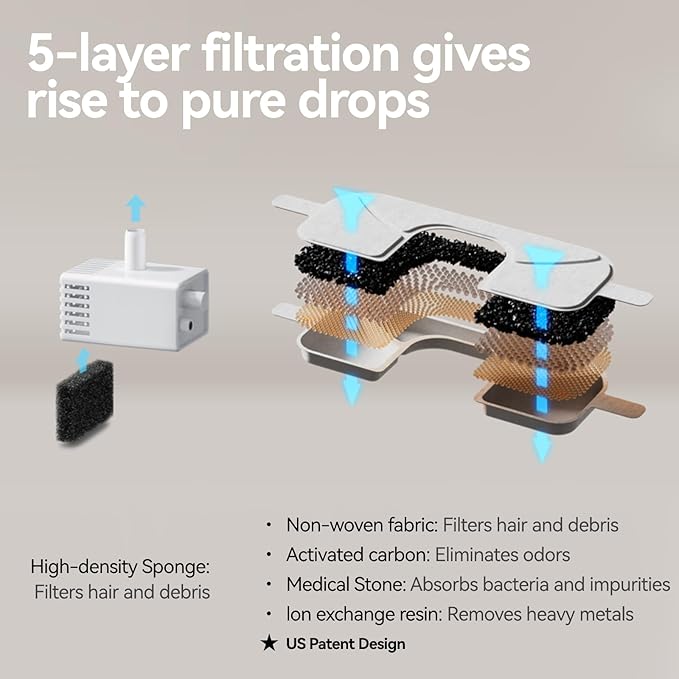 - [5-Layer Filtration System]The cat water dispenser features a 5-layer filtration system. Activated carbon removes bad taste and smell. Ion exchange resin softens tap water. Medical stone extracts heavy metals and releases trace elements. Non-woven fabric filters out hair and dirt. High-density sponge of the pump helps remove tiny particles. (Please search [B0DH1WFD6R] to buy the real filters.)