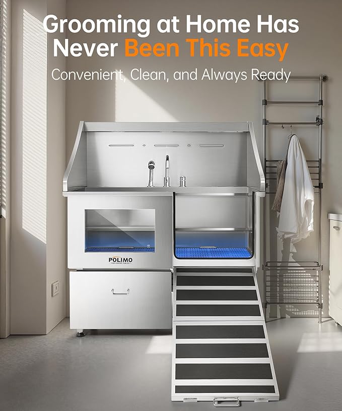 - Innovative and Practical Design: The POLIMO dog grooming station features multiple outstanding design elements: ① IP65 Waterproof high-brightness LED spotlight. ② Grade A tempered glass observation window. ③ The bathtub’s side panels feature a curved slide design, making it easier to operate④ Two-piece floor grid, adjustable to three different heights. ⑤ Sliding storage drawer for organized storage. ⑥ Multi-function faucet and showerhead, adjustable to left, center, or right positions.⑦ Two drainage options are available: one with a pet hair catcher and another stainless steel drain pipe featuring an odor-blocking S-trap design