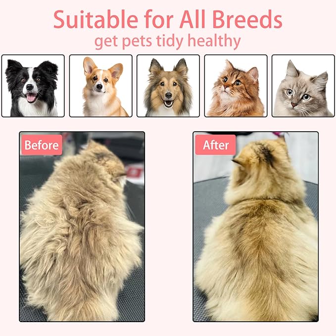 - 【Versatile & Easy to Use】:The pet grooming brush has 140° curved needles designed to make it easier to groom your pet's undercoat well. Metal button short press to change the spray speed, long press to turn on the UV light, it is a multi-functional grooming tool that combines cleaning, brushing, spraying and de-shedding