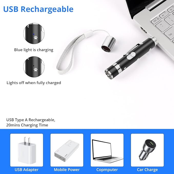 - 【USB Rechargeable Charging】This new interactive cat toy features a built-in USB port. Simply remove the back cover and plug it into any USB charger—no need for disposable batteries, making it more eco-friendly. Charge it using power banks, adapters, computers, or even your car. It's convenient and fully charges in about 20 mins.