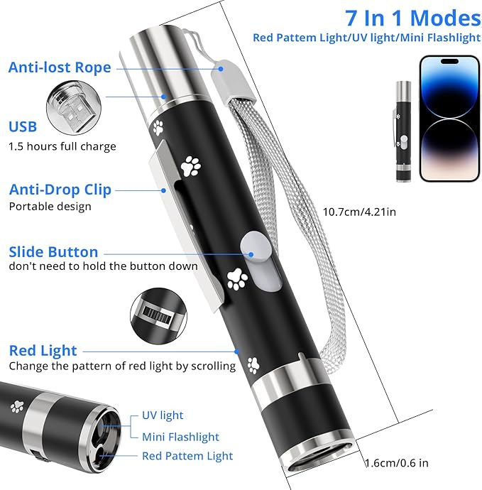 - 【Versatile Functionality】This cat light toy is more than just a pet accessory. It doubles as a presentation pointer with a bright beam for clear visibility. Easily activate it with a single push—no need to hold the button continuously. It also features a glow-in-the-dark light mode and a purple mode for detecting counterfeit money.