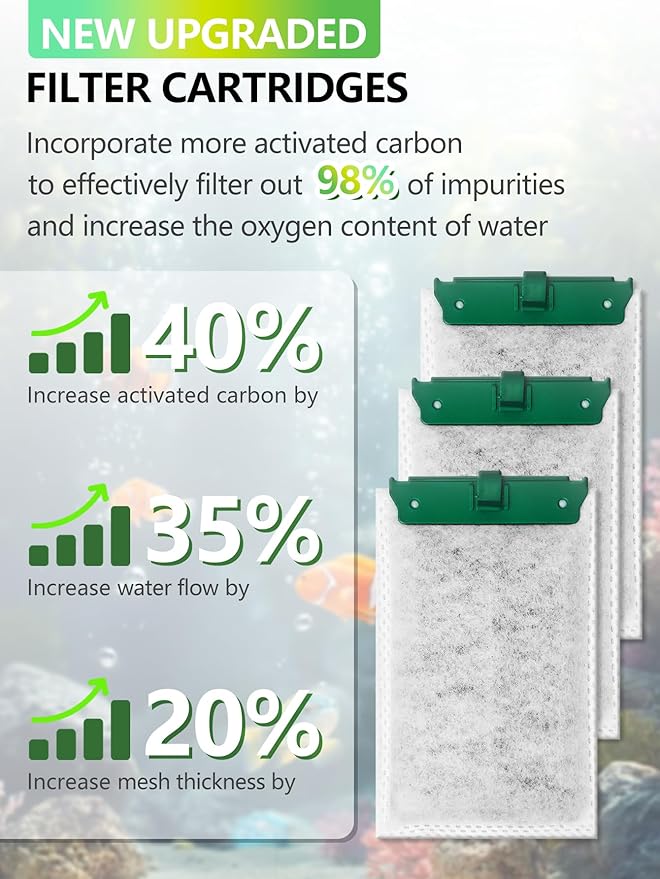 - Multi-Filtration System: The filter cartridge for fish and turtle tank utilizes coconut shell activated carbon (not ordinary carbon) and processed zeolite to effectively filter and absorb impurities, particles, and excrement in the water.