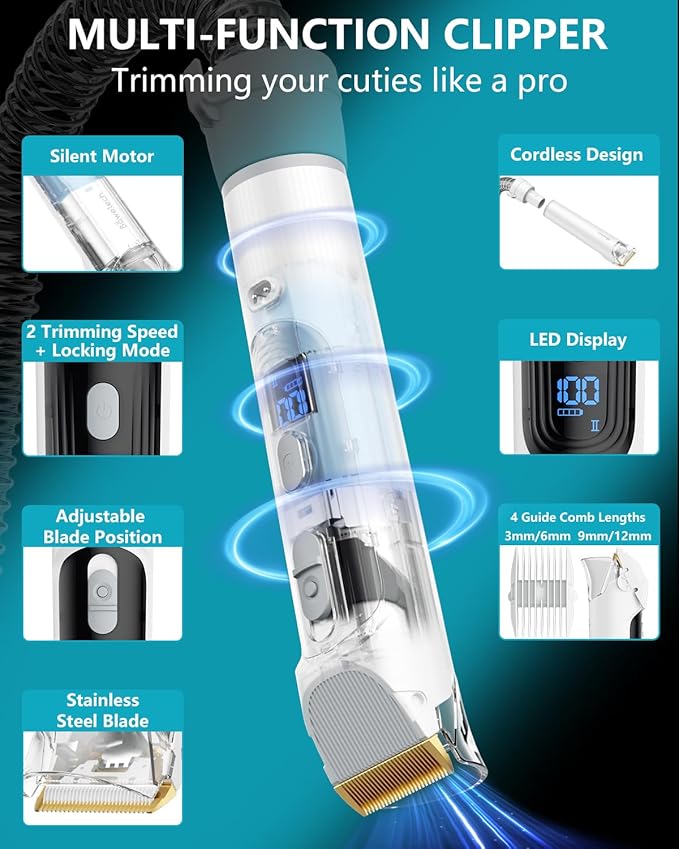 - 🐩【Versatile Clipper & 2L Large Capacity】This professional dog clipper for grooming features 7 cutting lengths and 2 speeds to trim your pets to any desired haircut. The LED display and detachable design enhance the ease of use and versatility of the trimmer. The dog vacuum has a 2L large dust box so you don't need to empty it frequently even if you are trimming a large & long-haird dog.