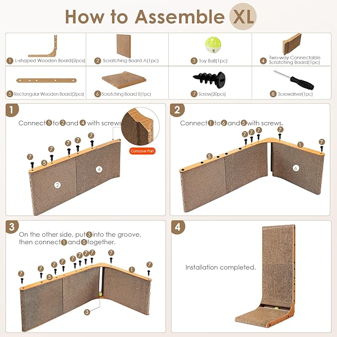 - EASY INSTALLATION: Our cat scratching board adopts a simple installation method and comes with instructions and necessary tools. We also provide an installation video so that you can install it quickly and easily.