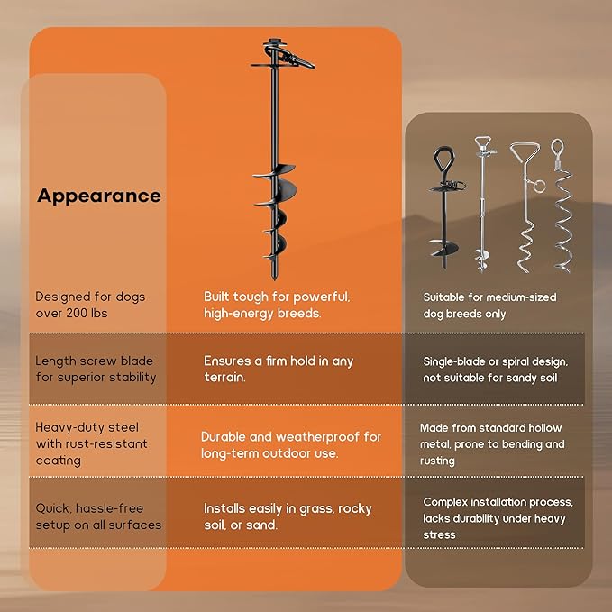 - 【Exceptional Craftsmanship】The dog leash anchor features a 360°precision-welded spiral that’s built to last, resisting bending or breaking even with heavy use. The rewide spiral double blades, coupled with the sharp tips, provide a firmer grip in the ground. Making sure your spiral stake works smoothly in any soil type, whether sandy, clay-rich, or rocky. It's designed for quick and easy installation in all kinds of terrain.