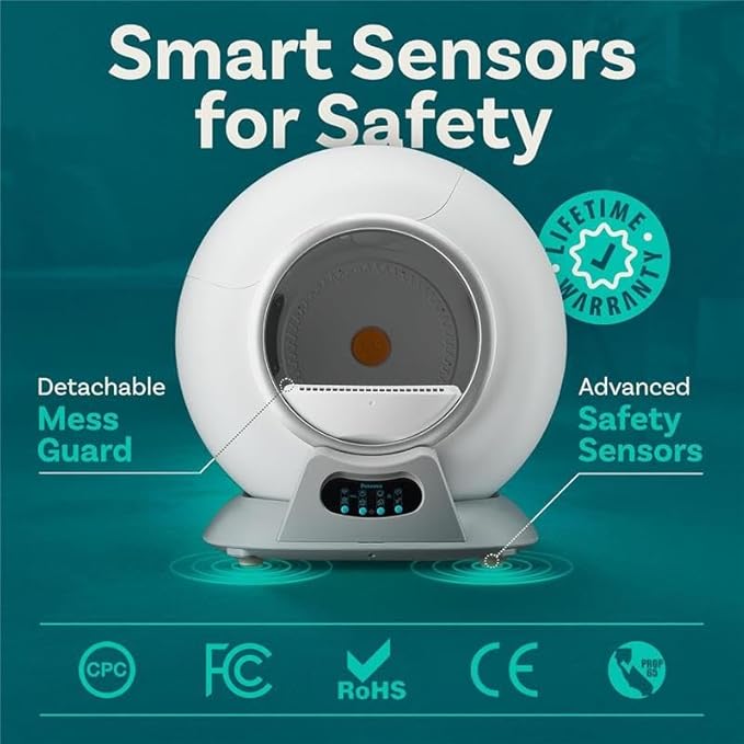 - 【Advanced Safety Features】 Anti-Pinch safety sensors stop the drum instantly if your cat approaches. Four weight sensors and an infrared sensor add layers of protection, while the child-lock and safe-entry mode keep both pets and kids safe during use