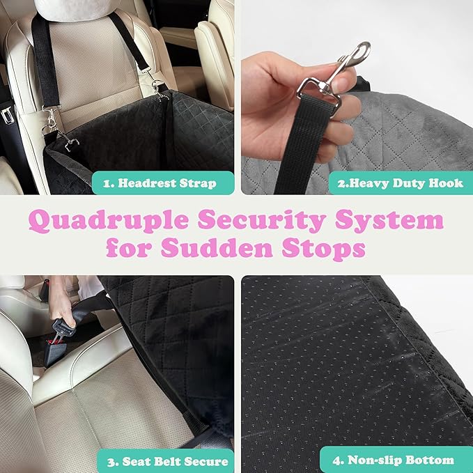 - 🚙 Secure Dog Car Seat for Safe Travel: No more sliding seats or sudden jolts that scare your pup; triple-point safety system with headrest strap, seatbelt pass-through, and safety tether keeps your fur baby secure during every turn and stop; perfect for anxious pets or first-time car riders