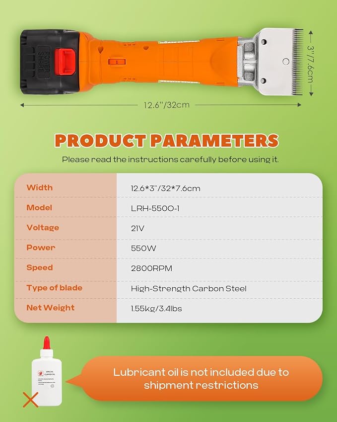 - [PACKING LIST]: 1 x Electric horse clipper ; 2 x 4000mAh lithium batteries; 1 x Charger; 1 x Cleaning brush; 1 x Oil bottle (WITHOUT oil); 1 x Blade tool driver; 1 x Durable carriage case; 1 x Operating manual. PLEASE Note: Lubricant oil is not included due to shipment restrictions; please buy SEWING MACHINE OIL separately. This oil effectively extends the clipper's lifespan.