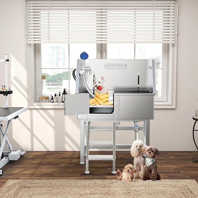 - 304 Stainless Steel Tub Construction: Featuring a seamless welded structure, our sturdy dog grooming bathtub is built for long-lasting durability, ensuring great sealing for an exceptional pet bathing experience, giving both pets and owners peace of mind