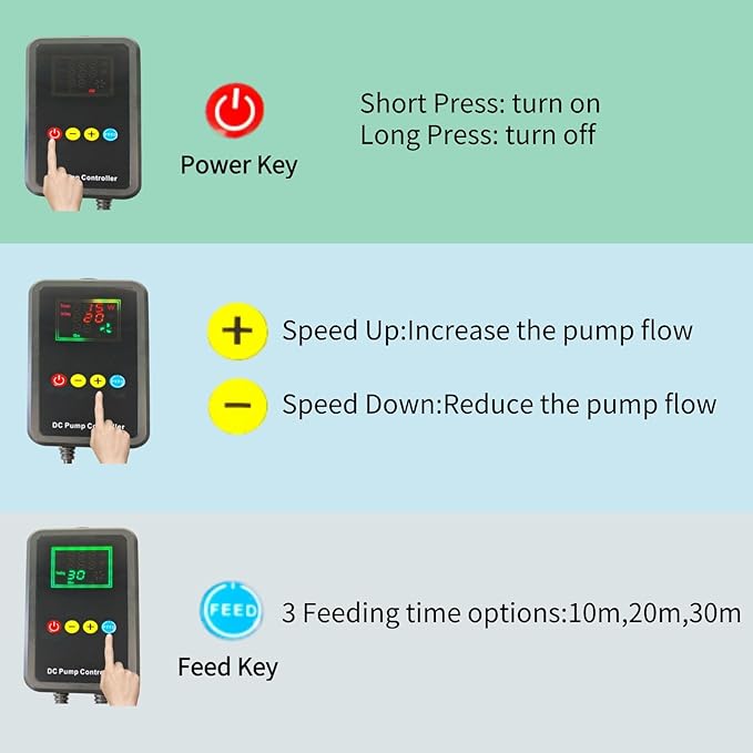- NOTE: 1.The impeller need to be cleaned regularly. If the water is very dirty, please refer to the maintenance video and clean the pump rotor every month.2.Make sure the power adapter and controller panel dry and clean.3.Avoid electric shock. Do not put the plug in water or other liquid.
