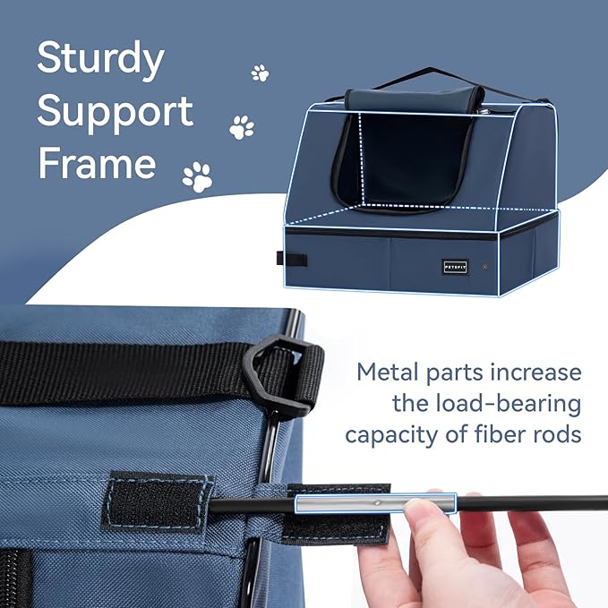 - Sturdy Support Frame: the travel litter box for cats is roomy(17" Lx13" Wx12.5" H) and durable, for the edges of the litter box, we use a rubber bone, and for the top, we employ fiber rods. In the middle of the fiber rods, we incorporate metal parts to ensure that the entire litter box is not only sturdy on the outside but also remains robust and does not collapse when the cat is digging in the litter inside.