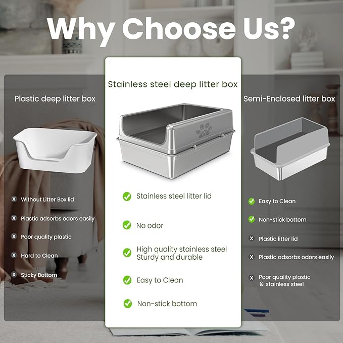 - Doesn't Absorb Odor & Easy to Clean --- The open top stainless steel cat litter box material characteristics will not collect any residue or odor, and the non-stick surface makes cleaning very easy, just a quick rinse and wipe with water to complete the cleaning easily. So if you don't like the characteristics of plastic litter boxes that will retain odor and want an easy way to clean, this stainless steel litter box is a great choice for you!