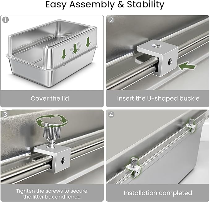 - Easy Assembly & Stability --- The enclosed stainless steel litter box with lid just uses the high-quality U-shaped metal knob clip to firmly snap the metal high-sided cover onto the stainless steel cat litter box to complete the installation. The Extra large litter box connection is more stable, no need to worry about the shell falling off, and it will not be easily kicked off when your cat jumps out.