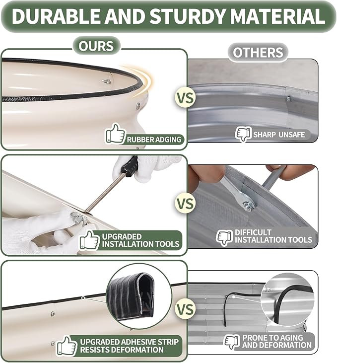 - 【High-Quality Materials & Durable】 Made from 0.7mm metal panels with double-layer anti-corrosion, this outdoor raised garden bed features a robust oval-shaped design for added strength and durability. Resistant to rust and corrosion, it provides a long-lasting gardening solution that can be reused for many years, ensuring a sustainable and reliable space for your plants to thrive