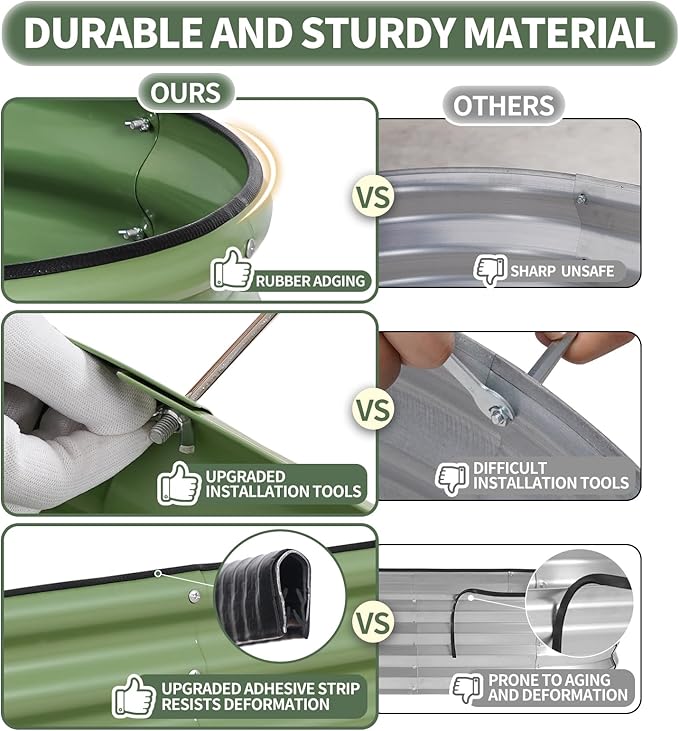 - 【High-Quality Materials & Durable】 Made from 0.7mm metal panels with double-layer anti-corrosion, this outdoor raised garden bed features a robust oval-shaped design for added strength and durability. Resistant to rust and corrosion, it provides a long-lasting gardening solution that can be reused for many years, ensuring a sustainable and reliable space for your plants to thrive