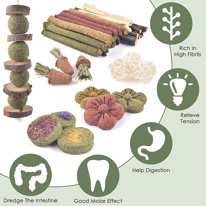 - Chewing & Treats & Toys: rabbit chew toys in a variety of shapes,.appealingly colored,rich colors attract small pets to chew.Timothy's long chew stick is suitable for hand feeding, increases interaction and improves the relationship between the owner and the pet