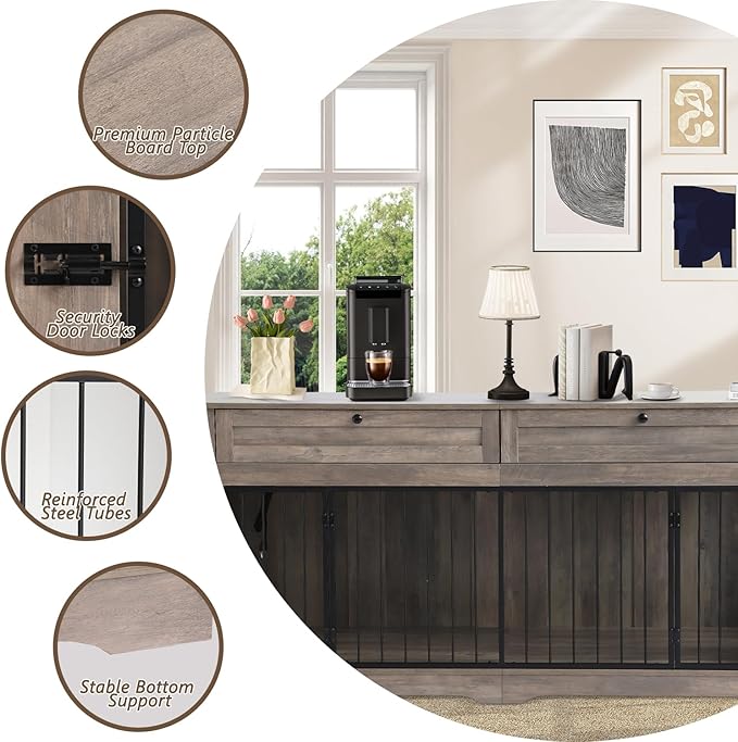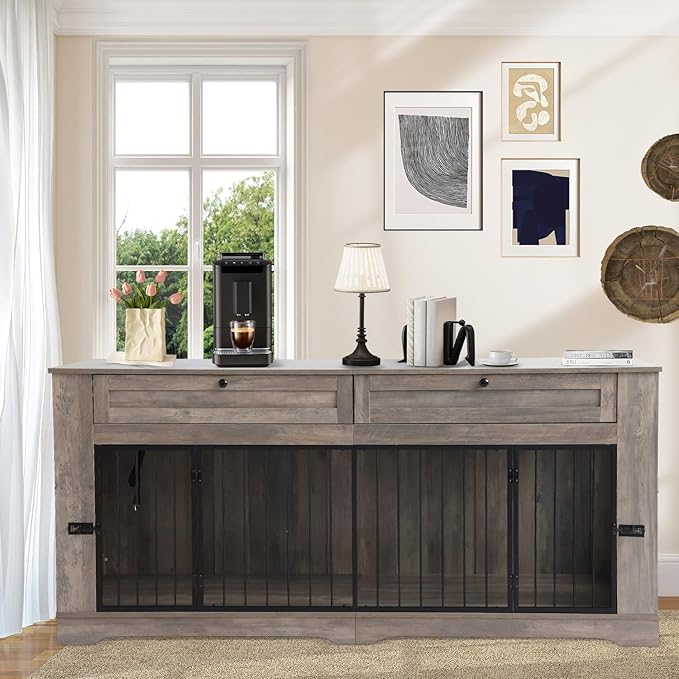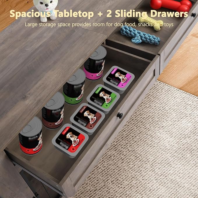 - Storage: Our dog kennel furniture features a spacious 70.86 "L x 23.6"W table top that can be used to display photo albums, potted plants or decorations. Load capacity up to 180 pounds. Two equal sized drawers for your dog's toys, clothes, etc. These Spaces are enough to keep your dog's toys, bowls, food, etc. tidy and organized