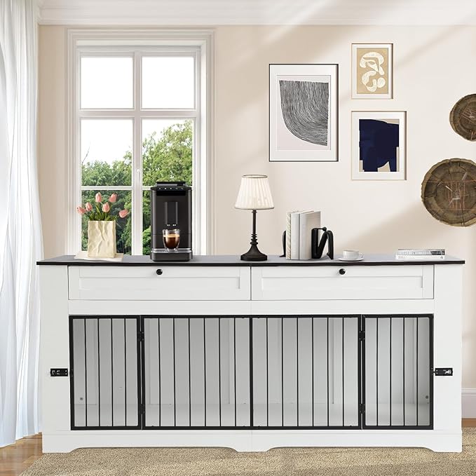 - Storage: Our dog kennel furniture features a spacious 70.86 "L x 23.6"W table top that can be used to display photo albums, potted plants or decorations. Load capacity up to 180 pounds. Two equal sized drawers for your dog's toys, clothes, etc. These Spaces are enough to keep your dog's toys, bowls, food, etc. tidy and organized