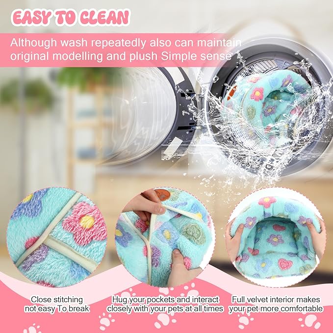 Wenqik 2 Pcs Guinea Pig Bed Cuddle Warm Hideout Small Animal Sack Cozy House Bedding Sleeping Cushion Portable Pet Carrier Cage Nest for Rabbit Hamster Rat (Green, Pink,Flowers)
