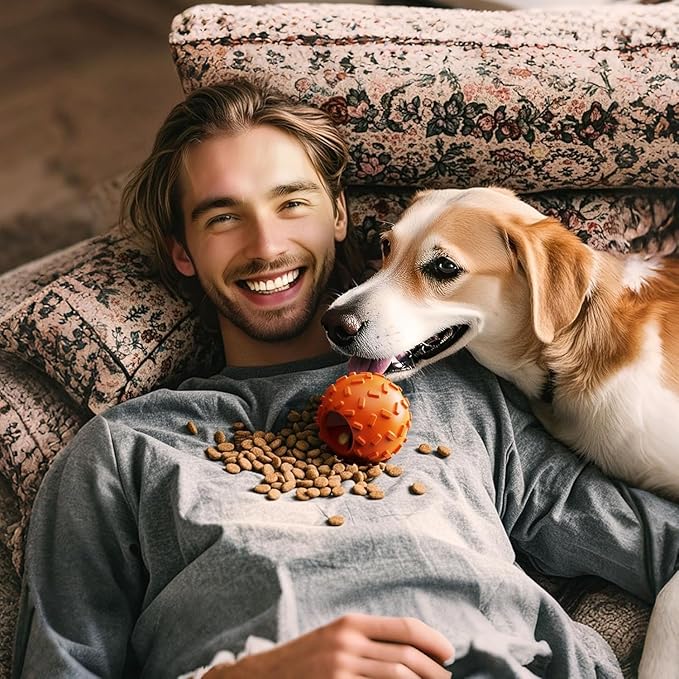 - This interactive dog ball is designed to prevent boredom while stimulating your dog’s mind. Made from eco-friendly natural rubber, it's safe, durable, and easy to clean. Simply add treats inside the ball to provide 20-40 minutes of fun, keeping your dog occupied and mentally engaged. It’s perfect for all dog sizes and works as a great tool for anxiety relief, reducing destructive behaviors caused by stress or loneliness—an ideal choice for dog toys to keep them busy and mental stimulation dog toys.