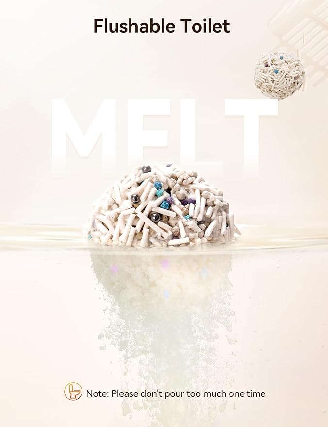 - 【Food-Grade Ingredients & Flushable】Our cat litter made from natural food-grade pea and corn fibers, safe and additive-free to ensure safe toileting for your feline. This cat litter can be dissolve in water and can be poured into the toilet (Note: pour small amounts of litter into the toilet multiple times to prevent clogging)