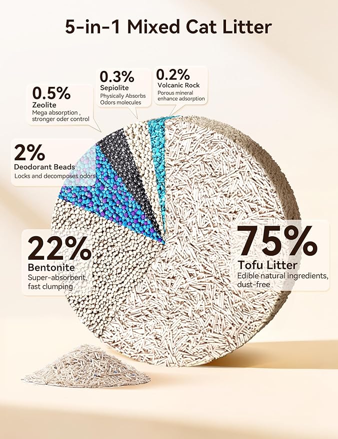 - 【5-in-1 Mixed Cat Litter】Meowant mixed cat litter adopts a scientific ratio, combining 75% tofu cat litter, 22% bentonite cat litter, 2% blue-purple deodorant beads, and adds zeolite, crushed mineral sand to improve stability. Mixed clumping cat litter is ideal for multi-cat households.