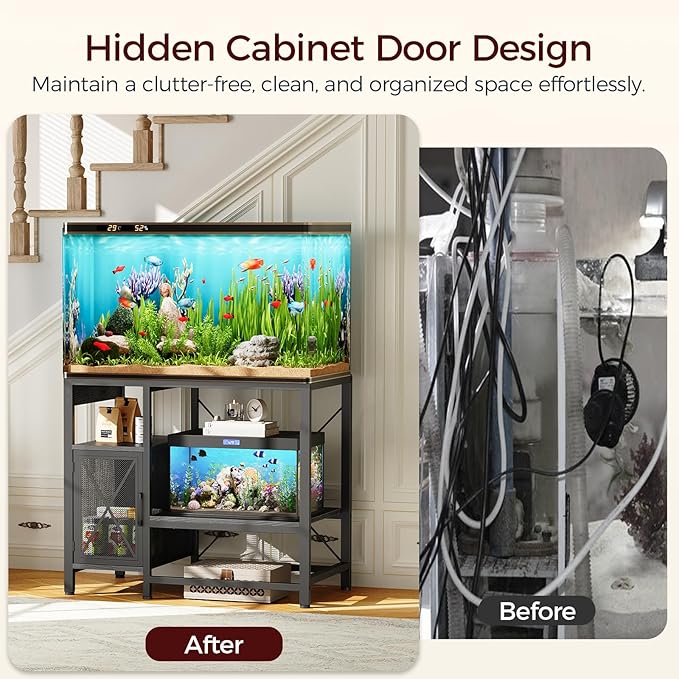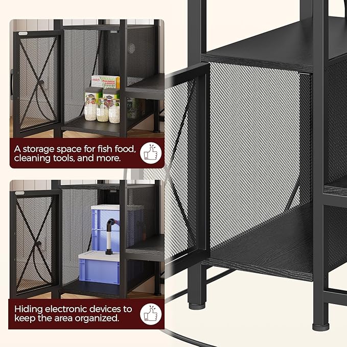 - Ample Storage: The fish tank stand with storage cabinets and shelves provides the right space for filters, tubing, fish food, etc., while the open shelves are functional for displaying accessories. Keep your aquarium area tidy and functional with everything at your fingertip
