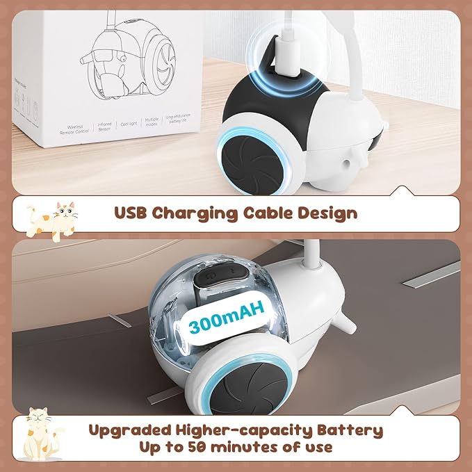 - USB Charging for Long-Lasting Play --- The automatic interactive cat toy is powered by a USB rechargeable battery (charging cable included). With a 300mAh battery, it takes just 1.5 hours to fully charge and provides up to 50 minutes of playtime. If left idle for 5 minutes, it automatically enters energy-saving standby mode and can be quickly reactivated with a gentle tap or touch.
