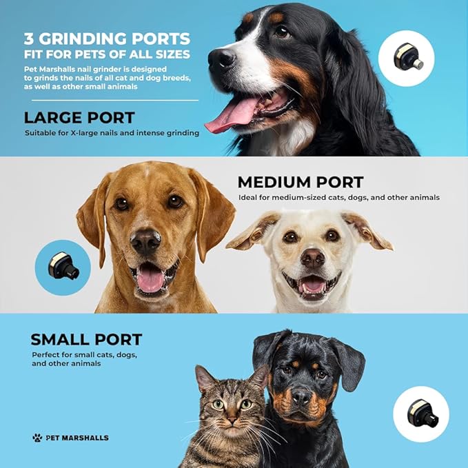 - Adjustable 3-Speed Motor & Multi-Port Design: Features 3 speed modes to handle every nail thickness—from tiny kittens to large breed dogs. Includes multiple port sizes to safely grind claws, making it a gentle dog claw trimmer grinder for all ages, including senior or anxious pets.