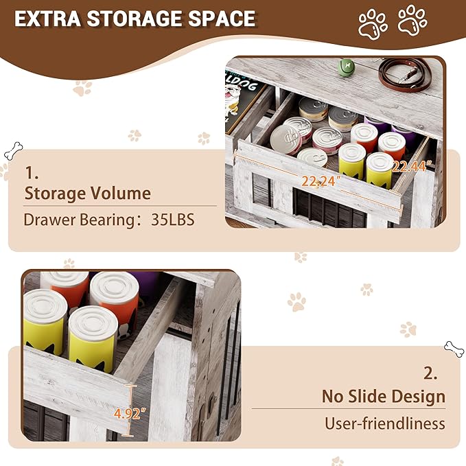 - Extra Storage Space:Two spacious storage drawers meet various needs, perfect for storing dog supplies. . For medium-sized dogs, the fence can be adjusted to create extra storage space.