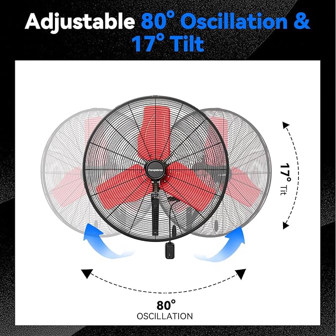 - ๐๐ข๐ฅ๐ญ๐ข๐ง๐ & ๐๐ฌ๐๐ข๐ฅ๐ฅ๐๐ญ๐ข๐ง๐ - The heavy-duty mental wall fan provides an automatic oscillation function of 80 degrees left and right, and the vertical tilt angle can be adjusted up to 17 degrees, helping you easily adjust the wind direction and enjoy the best comfort