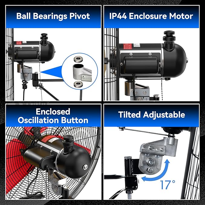 - ๐๐๐๐ฏ๐ฒ-๐๐ฎ๐ญ๐ฒ ๐๐ญ๐ซ๐ฎ๐๐ญ๐ฎ๐ซ๐ - Oscillating fan is sturdy and durable. OSHA compliant grille ensures safety, powder coating for excellent corrosion resistance, ball bearing pivot, equipped with wall mount, metal gear and aluminum blades enhance wind output. Rust-resistant grille ensures long-term safe and worry-free use while easy to clean and maintain.Extra long 6 feet + SIT waterproof power cord, 1/10 HP, 120V, 220 Watts, 60 Hz. UL safety certification