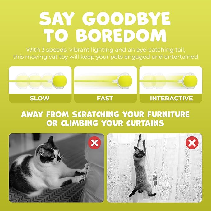- Say Goodbye to Boredom: Interactive Cat Chase Toy With 3 speeds (fast, slow and interactive), vibrant lighting and an eye-catching tail, this cat toys interactive will keep your pets engaged and entertained, away from scratching your furniture or climbing your curtains.
