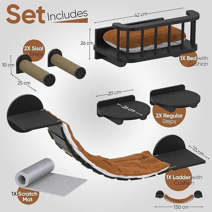 - THE COMPLETE CAT WALL SHELVES SET – EVERYTHING YOUR CAT NEEDS – Our 7-piece cat wall furniture set includes all the essentials: 2 sisal steps, 2 cat wall steps, 1 cushioned bed, 1 cushioned bridge/ladder, and 1 carpet scratch mat. Plus, all the necessary hardware and a step-by-step guide are included to make creating your cat's climbing paradise quick and easy!