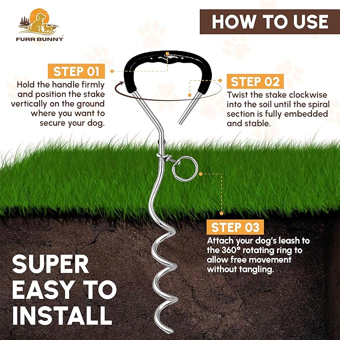 - QUICK SETUP. STRESS-FREE OUTDOOR TIME: Install the camping dog stake in seconds with a twist-in ergonomic handle—no tools required. Whether you're relaxing on the porch or working in the yard, your big dog stays nearby and secure, so you both enjoy the outdoors with peace of mind