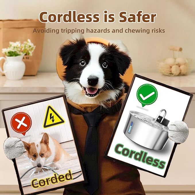 - 【Cordless Dog Water Fountain】Free your cordless dog water fountain from the constraints of wires, allowing your pet to enjoy fresh, clean water anywhere. You can place it flexibly in your dpg's favorite drinking spots - living room, bedroom, kitchen, bathroom, outdoors, and more. The absence of external wires prevents your furry friend from chewing on them.