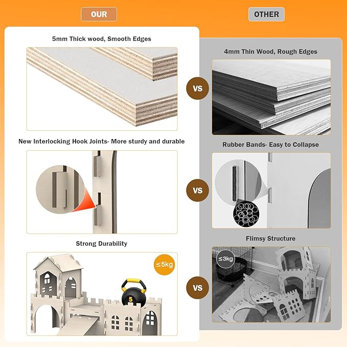- 【Chew-Resistant vs. Standard Rabbit Hideouts】: Tested by energetic Rex rabbits for 6+ months: Heavy-duty poplar plywood accents withstand daily gnawing. Compared to similar-priced rabbit houses and hideouts, our reinforced poplar plywood extend lifespan by 2X.