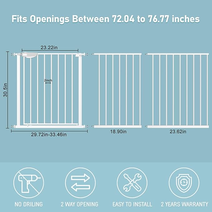 - 【Multi Use】The width of the triple lock extra wide pressure mounted baby gate can be adjusted from 25.59 inches to 81.49 inches so that it is available for stairs, doorways, and other diverse occasions to stop babies or pets to climb over. Tips: before installation, there will be a gap between the wide gate latch and the frame which is NOT a defect and it is NOT bent. This gap will disappear once installed.