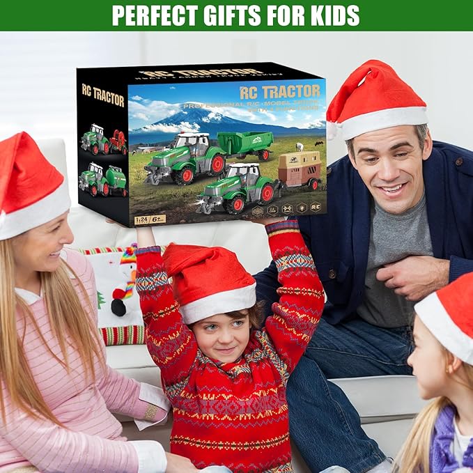 - Remote Control Tractor Set: This 1/24 scale remote-control tractor features four-channel precision control (forward/backward, left/right turns), working headlights, a detachable front section, and a self-unloading cargo bucket—perfect for enhancing children’s motor skills and hands-on creativity.