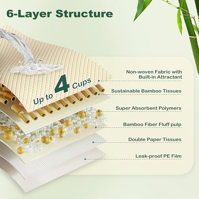 - Quick-Dry & Super Absorbent: The top non-woven fabric layer ensures quick absorption and fast drying, while the double tissue layers with super absorbent polymer lock in moisture by turning liquid into gel — allowing the pad to absorb up to 4 cups of liquid