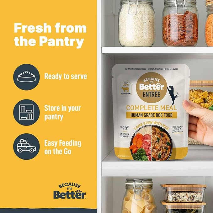 Because it's Better Entrée Complete Meal, Lamb Stew with Rice, Human Grade Wet Dog Food, 10 oz Pouches, 6 Count