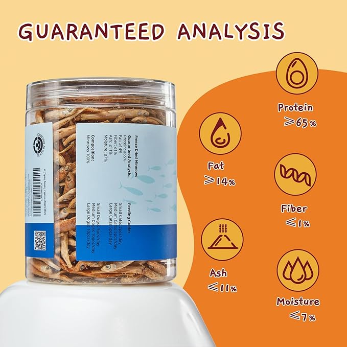 - FREEZE-DRIED MINNOWS: Our freeze-dried minnows are rich in protein and low in fat, made by using a gentle freeze-dried process, which is better locking in the original nutrients and freshness of the raw minnows, making your cats and dogs enjoy the flavor, also nourishing their skin and coat