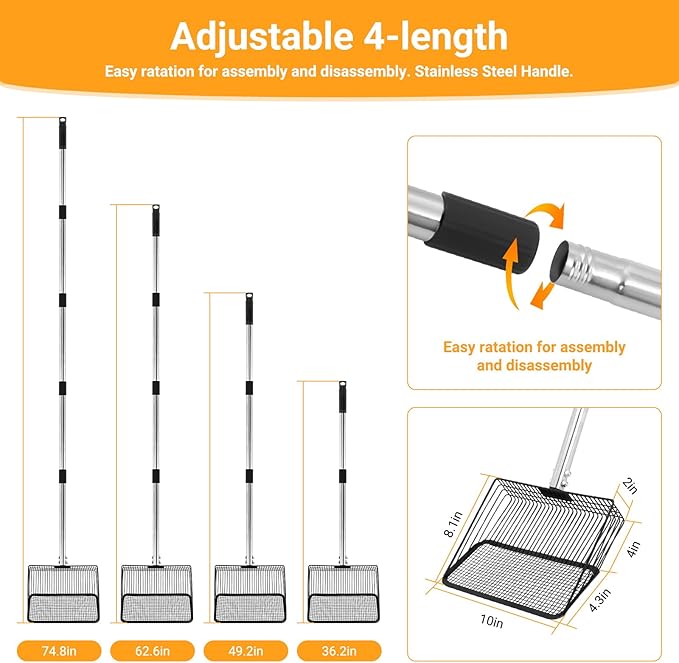 - 【Adjustable Handle Chicken Poop Rake (36", 49", 63", 75")】: Easily adapts to different heights and tasks (chicken coops, sandboxes, dog waste, horse stalls, etc.). The long handle (up to 75") minimizes bending, reducing back strain during cleaning.