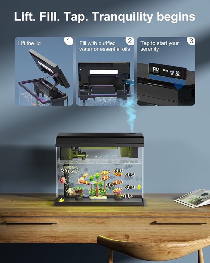 - Multifunctional Design: Compact desktop aquarium featuring temperature display, 7-color LED lighting, and aromatherapy humidifier. Ideal for desks, enhancing your oceanic ambiance