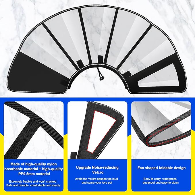 - 🔥【Safe and Easy to Clean】The outer edge of the dog head cone has a fluorescent reflective strip that can improve the safety of pets going for walks at night or in low light conditions. Smooth waterproof material can prevent dirt accumulation and is easy to wipe clean, allowing your pet to maintain hygiene and cleanliness during the recovery process