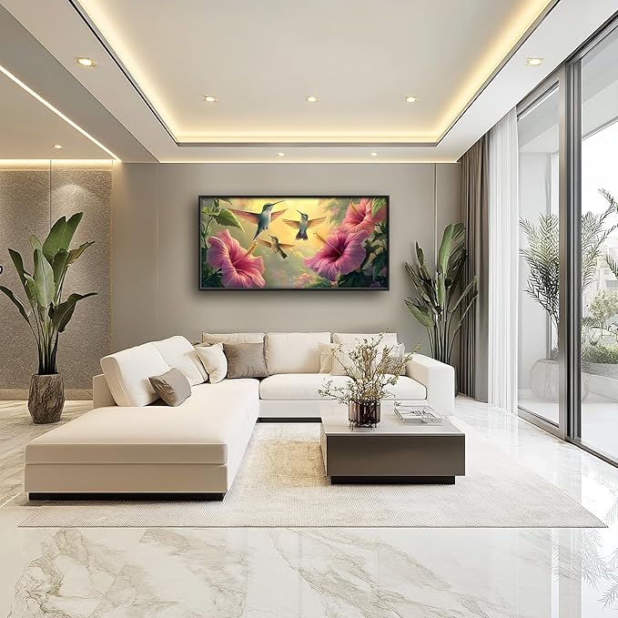 Framed Large Hummingbird Wall Art for Living Room, Oversized Rustic Bird Flower Wall Decor Floral Canvas Painting Nature Sunrise Pictures Modern Artwork for Bedroom Office Dinging Room 60"x30"