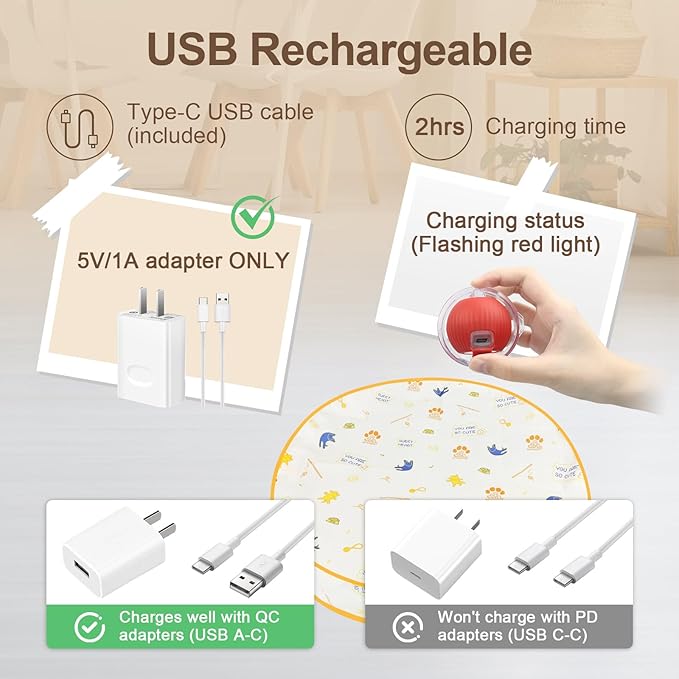 - USB Rechargeable: Easily rechargeable via USB, this cat toy eliminates the need for batteries. Low voltage indication: The red light flashes rapidly before shutting down. When charging, the red light flashes, and when fully charged, the red light remains on.