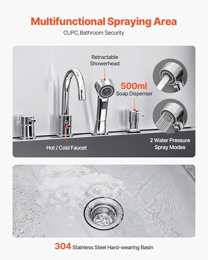 - More Comfortable Grooming: The dog grooming tub's faucet is featuring CUPC bathroom security certification, the hot and cold dual-control faucets and gentle/strong dual water pressure showerhead provide versatility. The 500 ml large-capacity soap dispenser ensures long-lasting use with each refill. The 304 stainless steel tub body is scratching-resistant and corrosion-proof